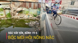 Kênh 19-5, quận Bình Tân, đoạn giao với kênh Tham Lương, mặt nước được phủ kín bởi các loại rác, nước dưới kênh chuyển sang màu đen ngòm, bốc mùi hôi thối nồng nặc, ảnh hưởng đến cuộc sống của người dân xung quanh.